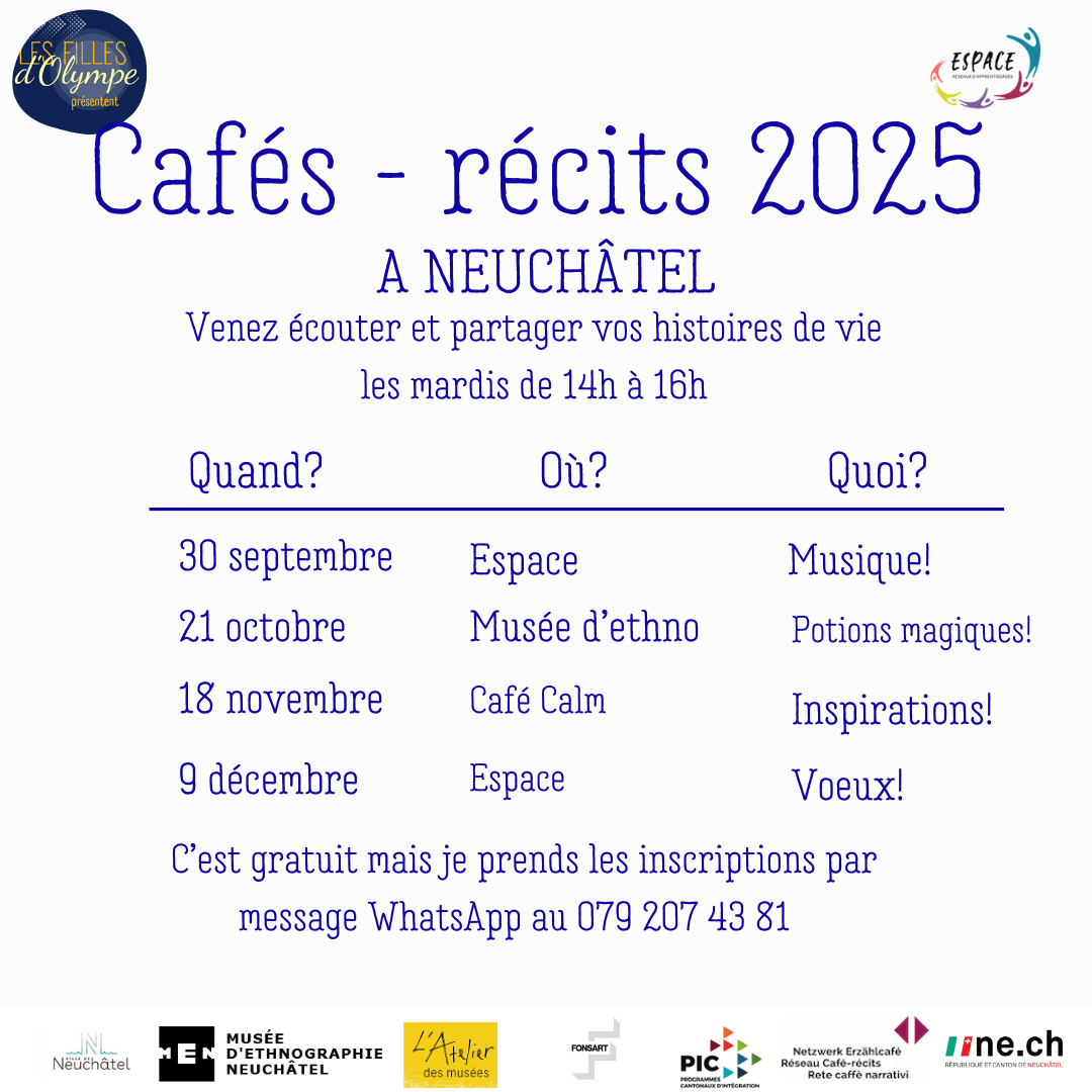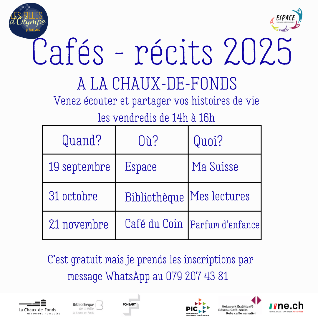 Les Café-Récits sont soutenus par Espace, le canton de Neuchâtel et les Villes de Neuchâtel et de La Chaux-de-Fonds, ainsi que par des lieux publics qui nous accueillent.